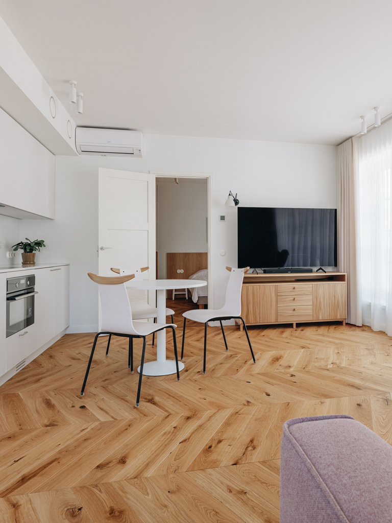 Sustainability is at the heart of Pargimaja. Solar panels on the roof generate clean energy, eco-friendly materials are used throughout, and furniture by Estonian brands Avila and Standard reflects local craftsmanship and responsible design.