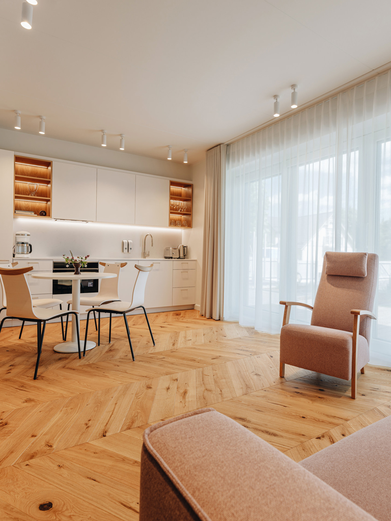 Inside, every detail speaks of balance and simplicity. Soft tones, natural materials, and high-quality finishes create a sense of warmth and calm throughout. Bathrooms are spacious and refined, some directly connected to bedrooms for privacy and ease. The open-plan kitchens and living areas invite shared moments and slow mornings, while the sauna provides a quiet retreat for relaxation and reflection.